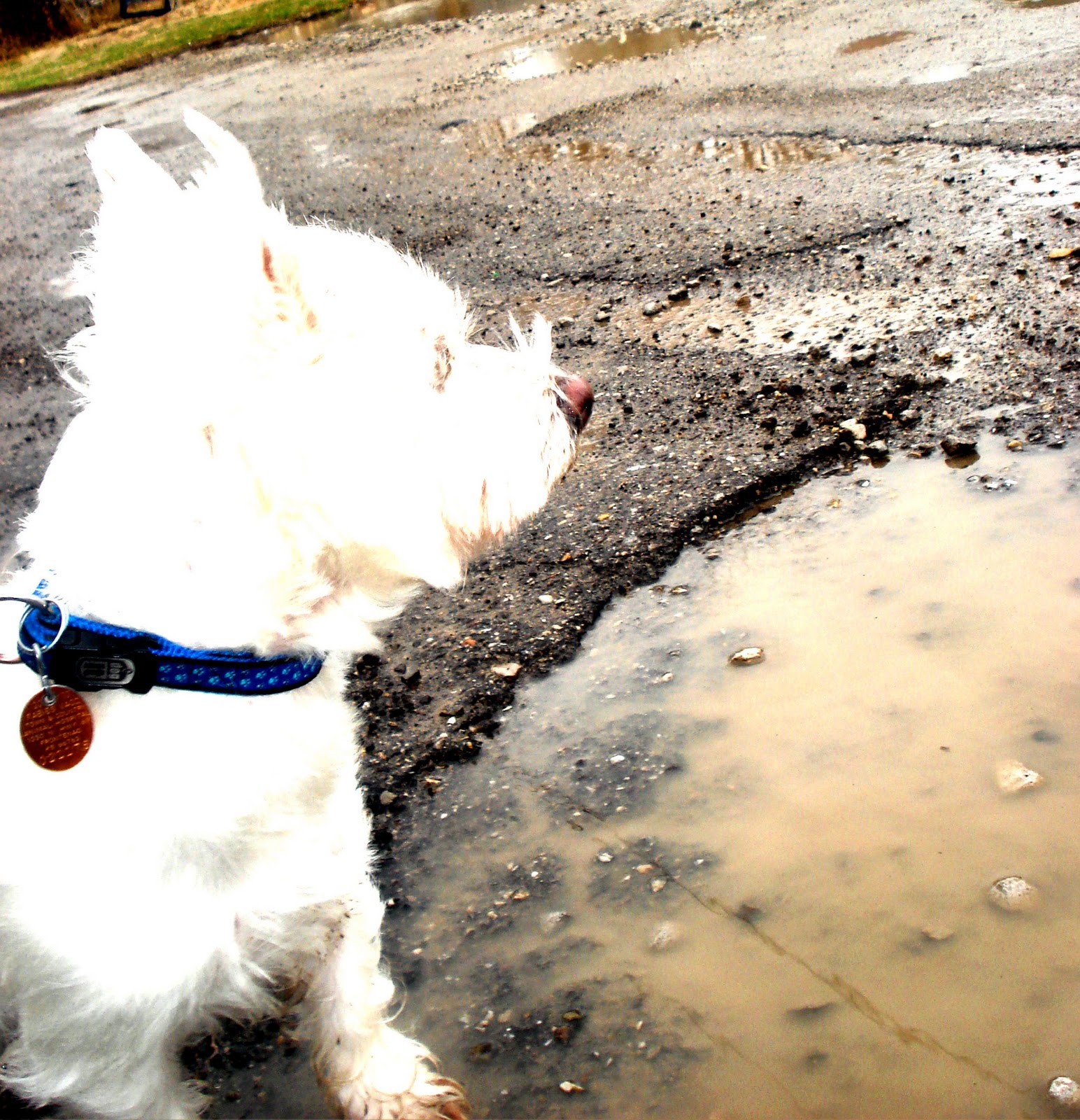 Today is bath day soooo before the trauma of such an activity takes place I decided that Duncan and I needed a little fun to cap off our weekend (FYI  duncan HATES baths and shakes and constantly tries to escape despite my best effort to make bath time fun time) so we went out and played in the mud puddles left after all of the rain we have had lately....... lets just say that by the time we came in you could not tell that he was usually  a nice fluffy white westie!